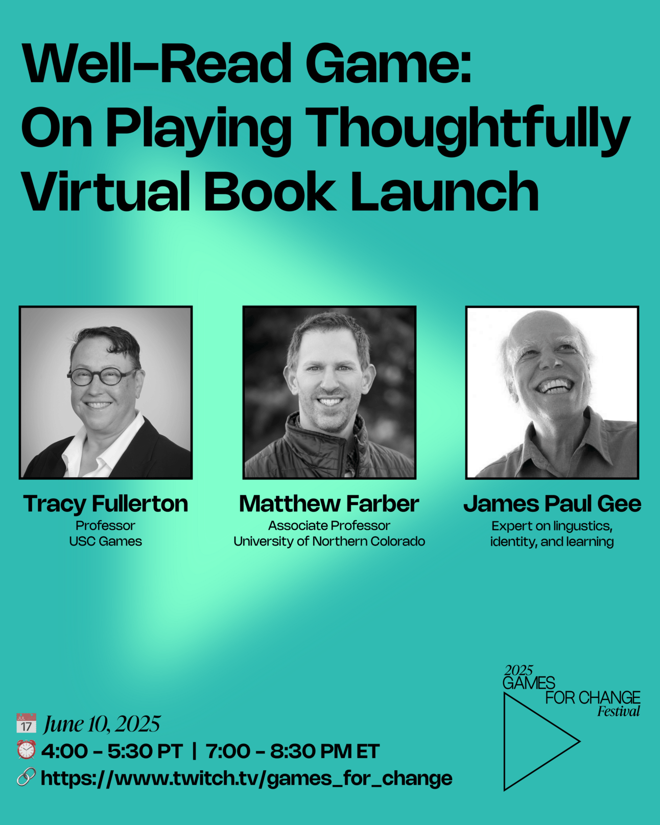 ![]() | Well-Read Game: On Playing Thoughtfully Virtual Book Launch Twenty years ago, scholar James Paul Gee established a foundation around games, learning, and literacy, which has had profound implications on game studies and learning game design. Join a conversation between Gee, Tracy Fullerton, and Matthew Farber, authors of the newly released The Well-Read Game: On Playing Thoughtfully, for a discussion that builds on these foundations to address games as literary experiences. This new theory of player response examines the experiences we have when playing games: not the outcomes of play or the aesthetics of formal game structures, but the ephemeral and emotional experiences of being in play. |